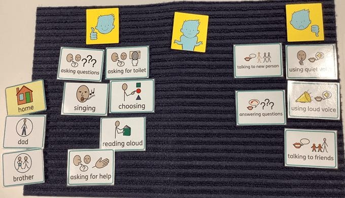 Selective Mutism is a form of social anxiety characterised by stark differences in how a person communicates in different situations. There is also acute awareness of everyone around them who may be listening, either intentionally or accidentally. In Education settings Selective Mutism often become apparent at times of transition and teachers often describe a very different child to the one a parent knows at home. As a school therapist I have the job of finding the puzzle pieces and bringing them together in a way that home and school can understand. I have found the Talking Mats approach to be very useful when working in this area. Here’s an example;