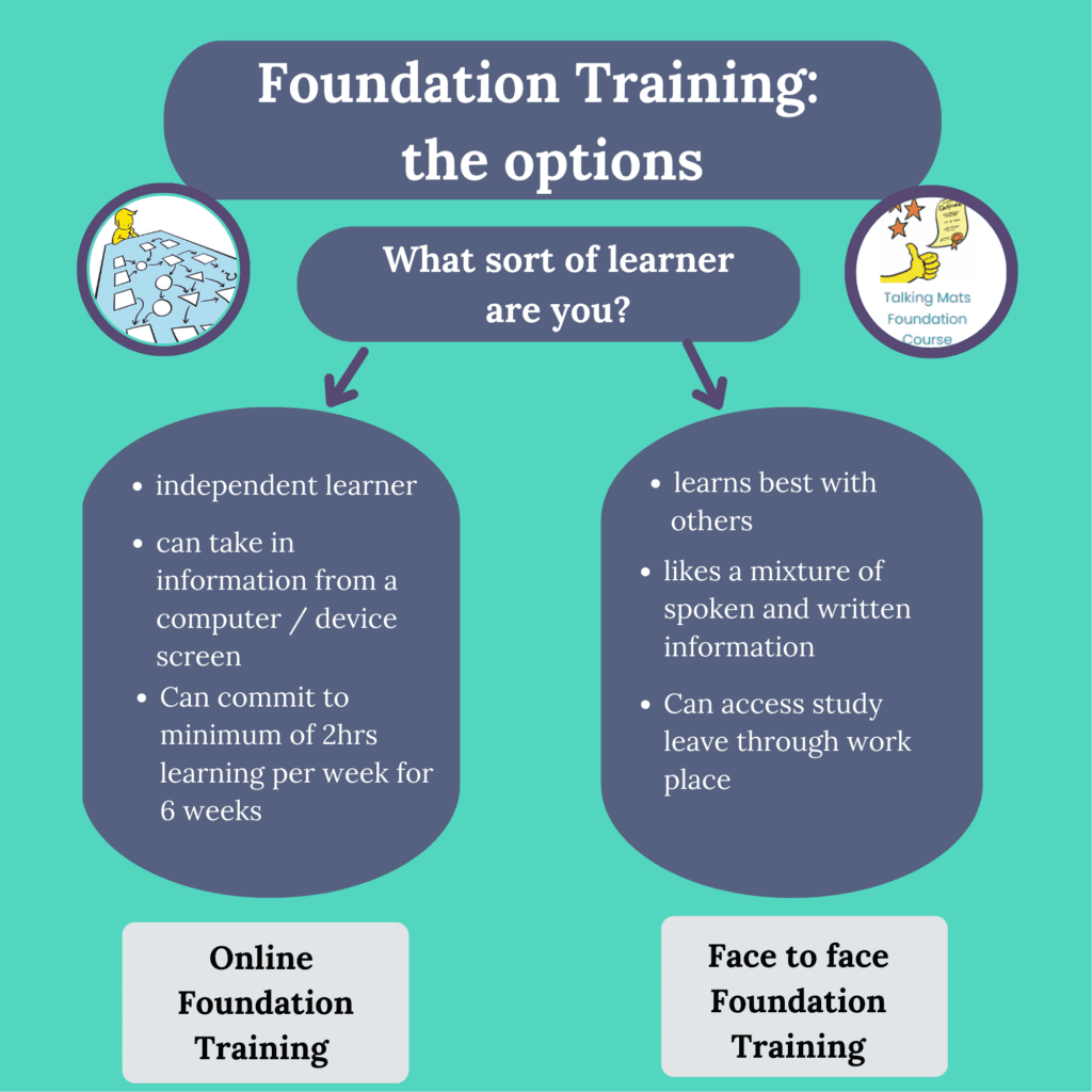 You’ve made the decision that you’ll get trained in Talking Mats. What options are there to let you do this? Like all training providers over the last 3 years Talking Mats has had to adapt our training provisions. We have also had to be responsive to what our customers want; there is a much bigger demand for virtual training and online training than we experienced pre 2020. To reflect this we currently offer a variety of ways you can access our Foundation Training. Your choice will depend on the answers to several questions; what sort of learner are you? Can you do this as part of your working day or will it be in your own time? Can you apply for study leave? Following from that; would you like to buy a resource with your training and what is available ? The following diagrams should help simplify things and more in depth information about Foundation Training is on our website, as well as booking information. Being trained in Talking Mats allows you to access all our Advanced Courses and Resources and go on to become a Licenced Trainer.